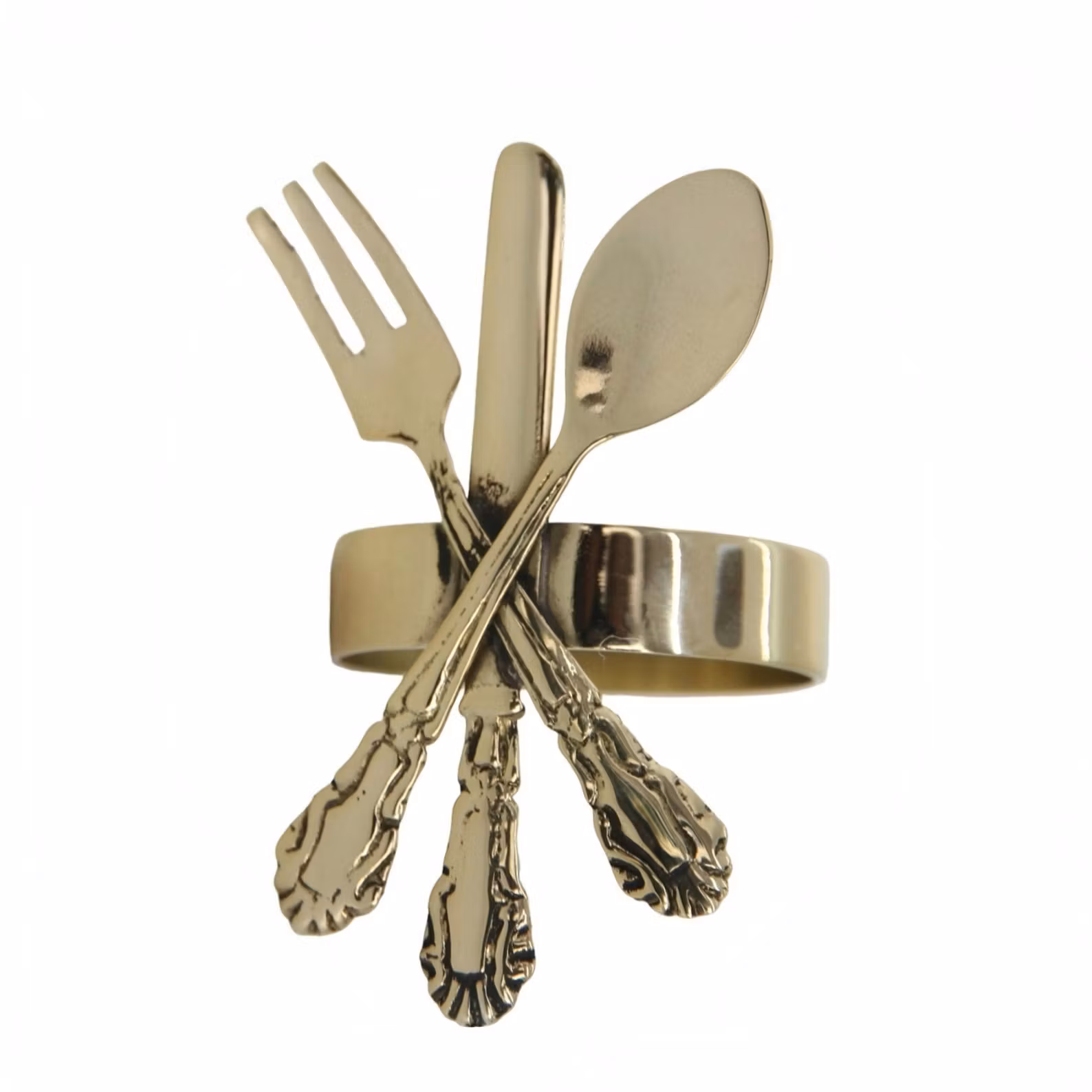 Underbar servettring som direkt för tankarna till matglädje och fest. Denna servettring från Gusums Messing är, i all sin enkelhet, ett mästerprov på precision och hantverksskicklighet. Varje bestick är gjutet för sig och därefter varsamt sammanfogat till en harmonisk helhet, fäst på ringen. Allt är handgjort i mässing.