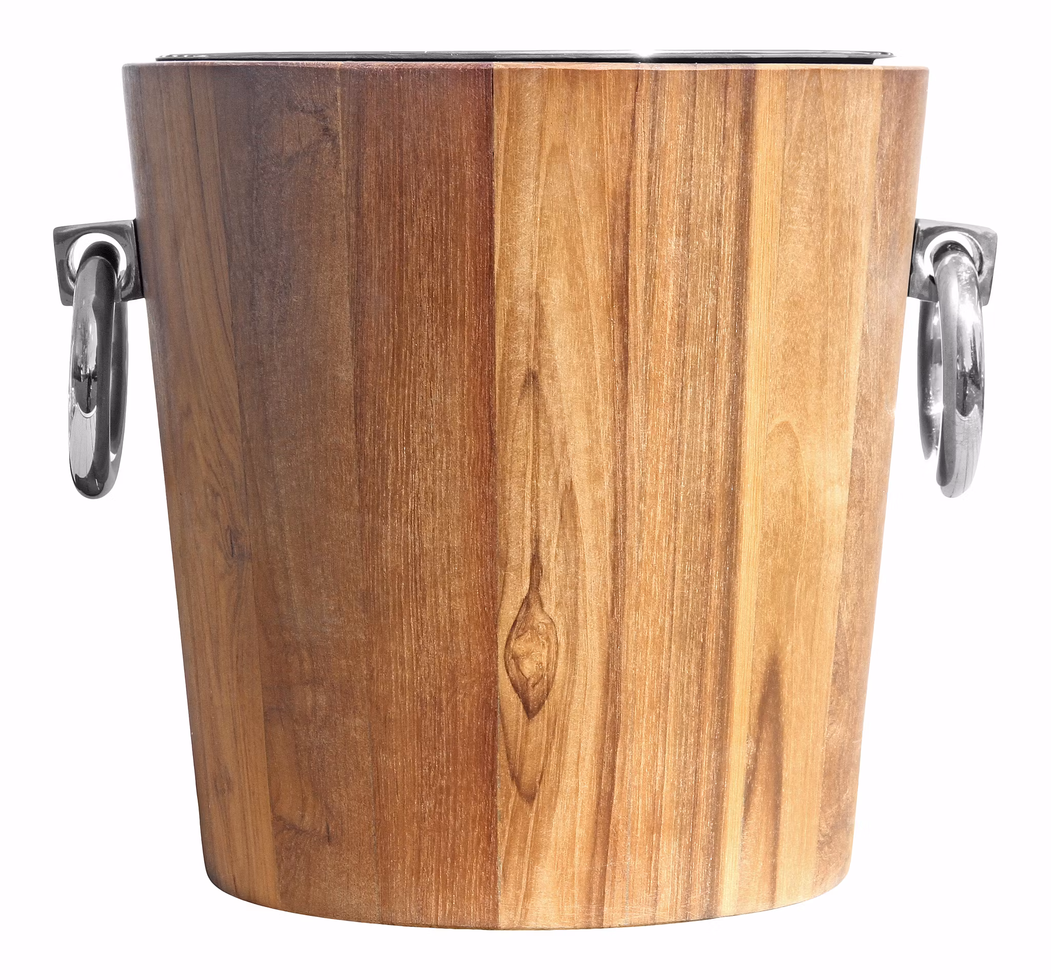 Denna fantastiska champagne- och vinkylare, är 25 cm i höjd och 25 cm i diameter, gjord i återvunnen teak och rostfritt stål. Den inre delen i rostfritt stål är också isolerad för att hålla kylan ännu bättre, vilket du d´ser på en av bilderna.