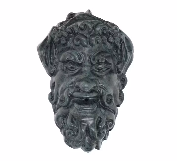Här har vi en vacker väggfontän med ett antikt ansikte, gjuten i aluminium och grönpatinerad för att ge ett bronserat utseende. För att klara av vattenpåfrestningar är den också epoxilackerad.